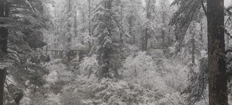 冷杉林海被白雪覆盖,满覆银霜,形成成片的雪凇雾凇。偶有小动物穿林而过,撞落枝丫的雪块,蹭一身雪再逃走。