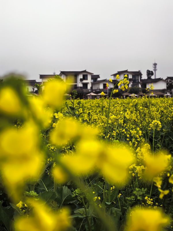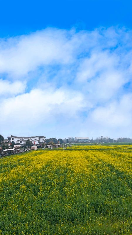 成都新晋“小婺源”,一幢幢青瓦白墙的小房子,被青翠碧绿的油菜叶、金灿灿的油菜花装扮着,呈现出一副诗意田园的模样。