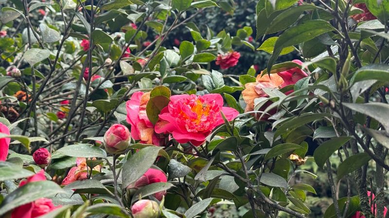 深处的茶花树高大繁密,树枝上挂满了艳丽的山茶花,地上还有掉落下来的,居然有种奢靡之感,怪不得山茶花被当作香奈儿的主题花。
