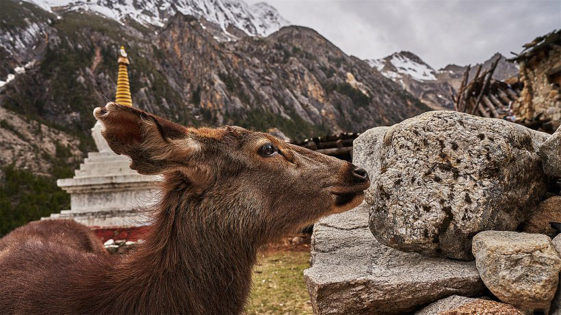 行程第三天会安排轻徒步,终点寺庙常年“喂养”附近的野生岩羊、山羊,它们是这里的小精灵,根本不怕人,甚至会趴在你身上~拿上吃的就可以互动拍照。