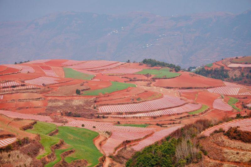 炫目的赤红色将土地和农作物分区划线