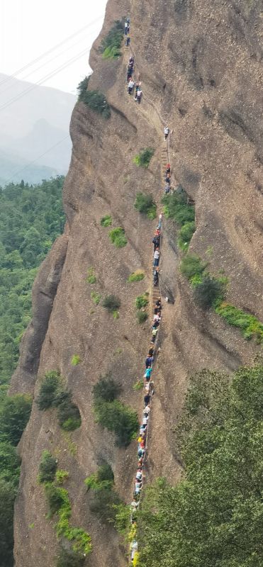 和鸟道相比,猿猱道更为险峻,这里没有护栏,路面也更狭窄,攀登者仅靠腰间的安全绳,与手中的铁扣扣住铁索,单人单向缓慢前行。