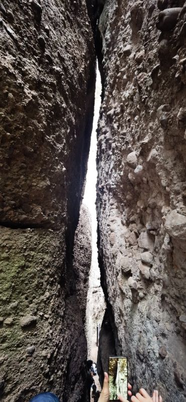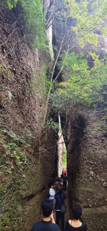 还可以体验一下“一线天”,一线天又名宝剑岩,仅容一人侧身而过,两岩所留缝隙好似一柄宝剑剑柄朝地,在逆光效果下,剑身闪闪放光,让人忍不住赞叹自然的鬼斧神工。
