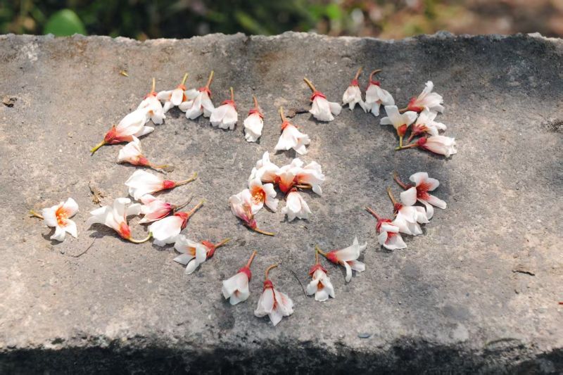 桐子花清高素雅,总是在料峭春寒之后悄然开放,白色的花瓣里藏着一颗,小小的,粉红的心。微风拂过,大片大片的花瓣便随风飘落,似漫步在花语的梦境中。
