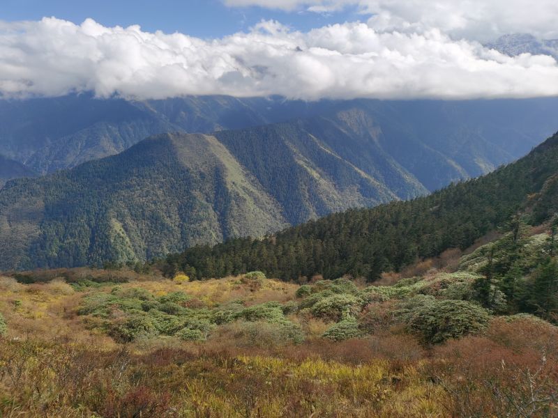 徒步经过草甸、灌木丛,极速爬升达到上方垭口登顶海拔4230米花林顶峰,即可遥望幺妹峰等众多远处雪山,云海尤为壮观,运气好的话还能看到佛光。