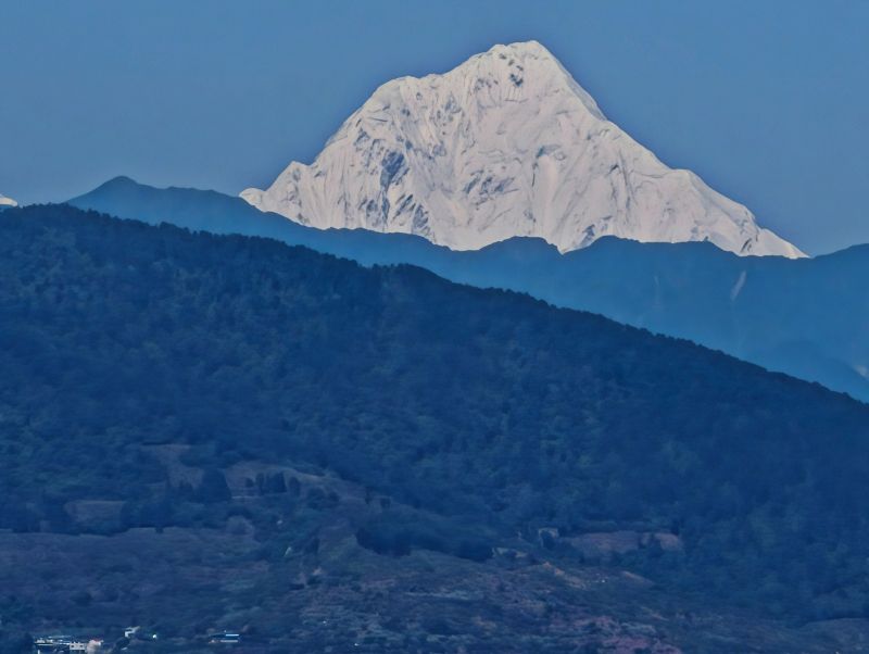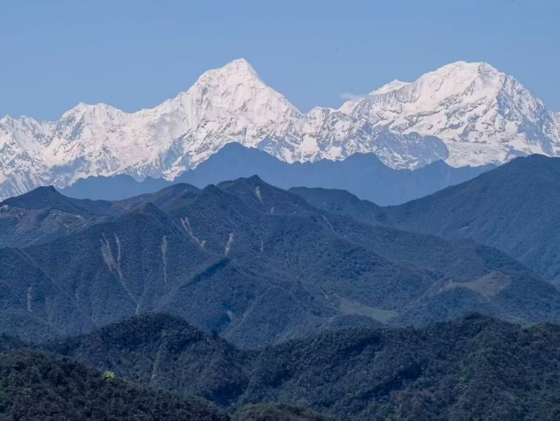 距离贡嘎雪山直线距离大约七十公里左右,只要天气好,眺望雪山角度比牛背山都正,中锋和贡嘎主峰都毫无遮挡。