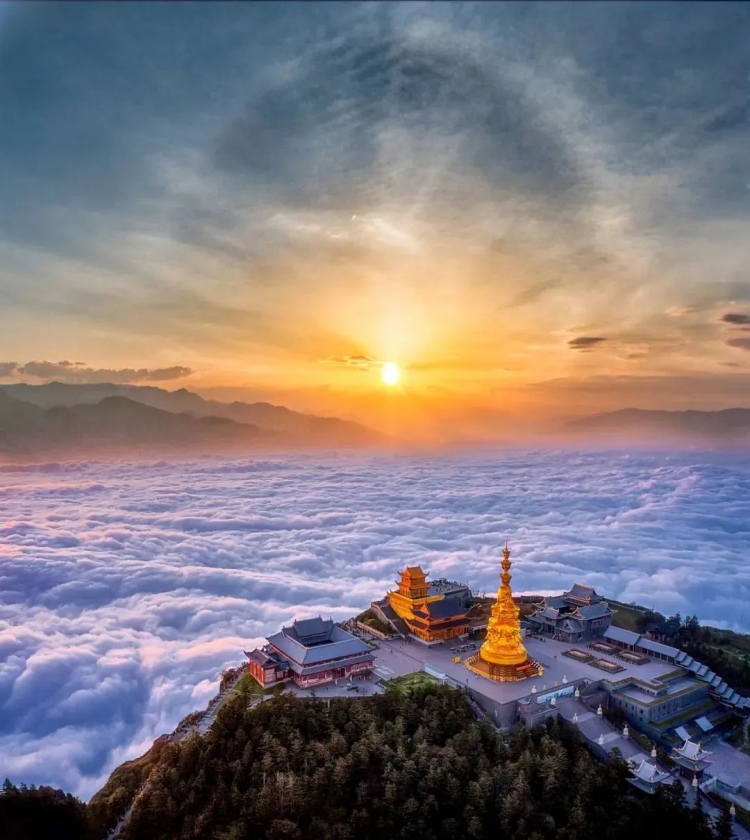 峨眉山为人称道的便是金顶日出,矗立高山,远眺云海。橙色的暖光划破黑暗,随着时间推移将整个世界点亮。