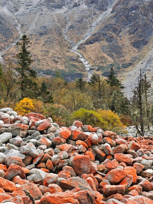 这里是理小路精华景点之一:这里有雪山、森林、草甸、溪流…尤其是规模宏大的红石滩,是除了海螺沟红石滩之外,中国第二大红石滩!!在山谷里绵延一两公里,非常壮观,山地立体型气候,空气污染度为零,属于原始生态景点,关键无门票。跟随领队前往红石滩徒步2公里,近距离感受雪山脚下的红色石滩,在此游玩2个小时,午餐可在此自由觅食,有烧烤,小吃,方便面等,也可以自带,随后继续沿着理小路前行。