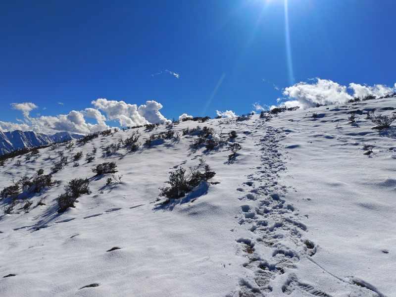 沿高山草甸上行约1公里即可到达垭斯梁山脊线。挂上经幡,像当地人一样抛撒隆达,祈求保佑吉祥如意。与自然对话,敬畏自然、感恩所有。