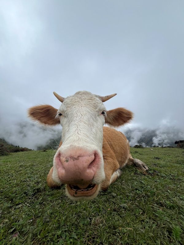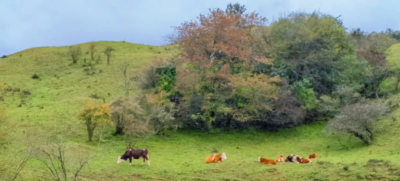 涉过海子,越过山坡,牧场芳草绿萋萋,风柔软得像绸缎一样拂过面庞,细雨微凉体感舒适,这里,牧歌如风般述说。或是食天地灵气,这片高山草地上的牛羊健硕,散漫地游走在草甸,啃食嫩芽儿。也或是少有人扰,生性温顺的它们,面对镜头毫无怯意,满眼的温柔与好奇。