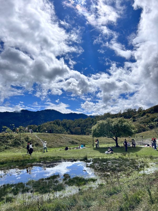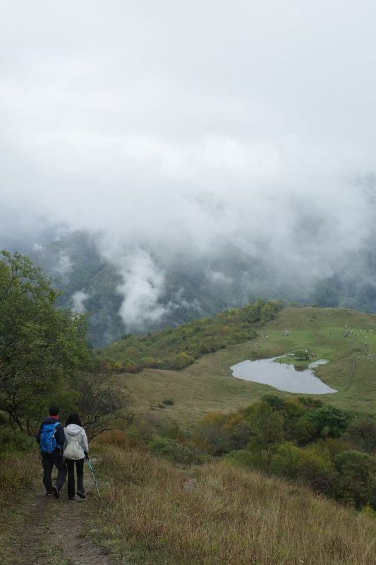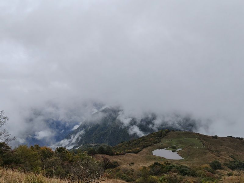 透过嫩绿的草叶儿依然能预见它碧空如洗的静美,草丛中点缀着各色草甸小野花,在春风中娇小且倔强。风徐徐而来,远处的雪山渐渐显露身姿,层层绿色在缥缈的云雾中忽明忽暗,云雾从山涧升腾而起或从山尖倾泻散漫开来,宛如仙境,美到窒息。