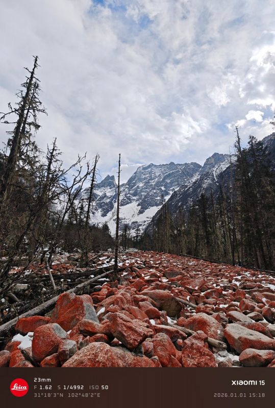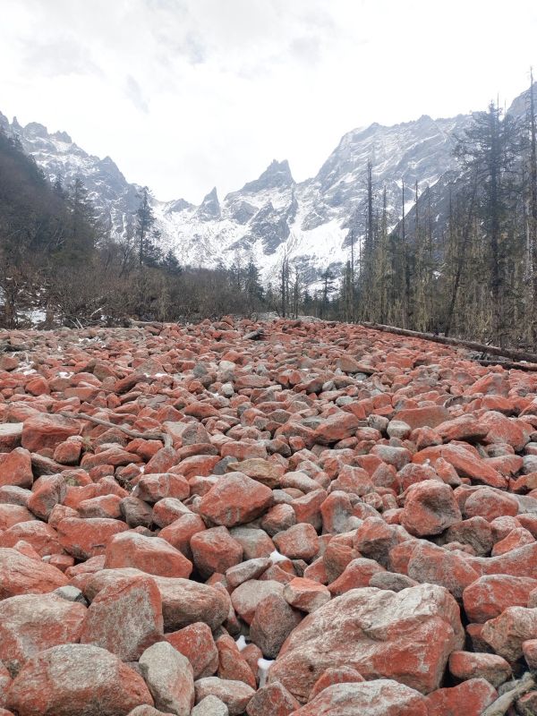 【红石滩】在大二普游玩结束后,我们继续乘车前往凉台沟/红石滩,这里有雪山、森林、草甸、溪流…尤其是规模宏大的红石滩,是除了海螺沟红石滩之外,中国第二大红石滩!!在山谷里绵延一两公里,非常壮观,山地立体型气候,空气污染度为零,属于原始生态景点,关键无门票。跟随领队前往红石滩徒步2公里,近距离感受雪山脚下的红色石滩,在此游玩2个小时。