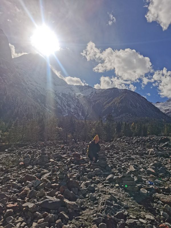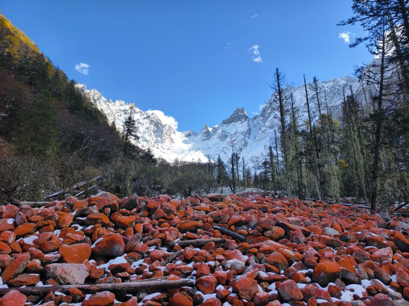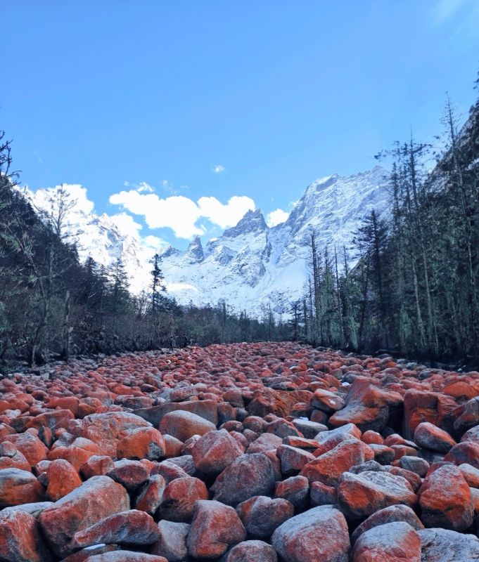 【红石滩】在大二普游玩结束后,我们继续乘车前往凉台沟/红石滩,这里有雪山、森林、草甸、溪流…尤其是规模宏大的红石滩,是除了海螺沟红石滩之外,中国第二大红石滩!!在山谷里绵延一两公里,非常壮观,山地立体型气候,空气污染度为零,属于原始生态景点,关键无门票。跟随领队前往红石滩徒步2公里,近距离感受雪山脚下的红色石滩,在此游玩2个小时。