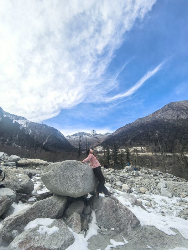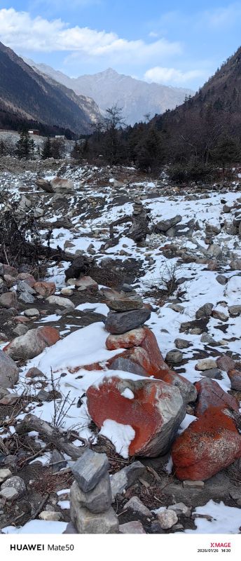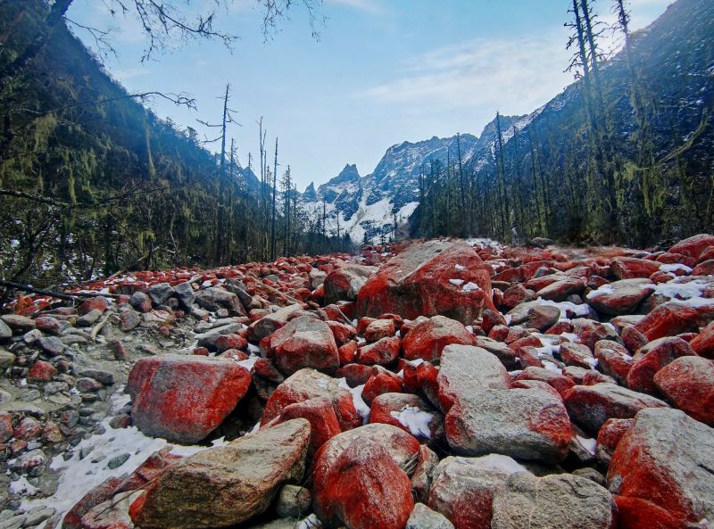 【红石滩】在大二普游玩结束后,我们继续乘车前往凉台沟/红石滩,这里有雪山、森林、草甸、溪流…尤其是规模宏大的红石滩,是除了海螺沟红石滩之外,中国第二大红石滩!!在山谷里绵延一两公里,非常壮观,山地立体型气候,空气污染度为零,属于原始生态景点,关键无门票。跟随领队前往红石滩徒步2公里,近距离感受雪山脚下的红色石滩,在此游玩2个小时。