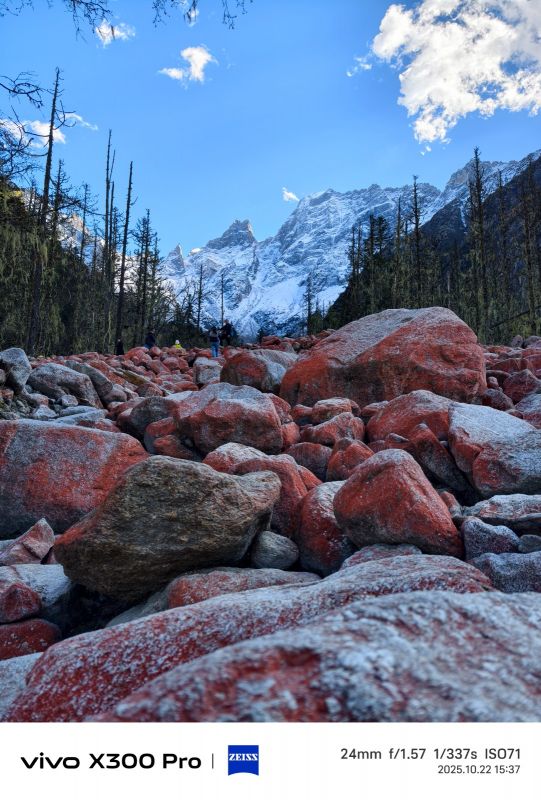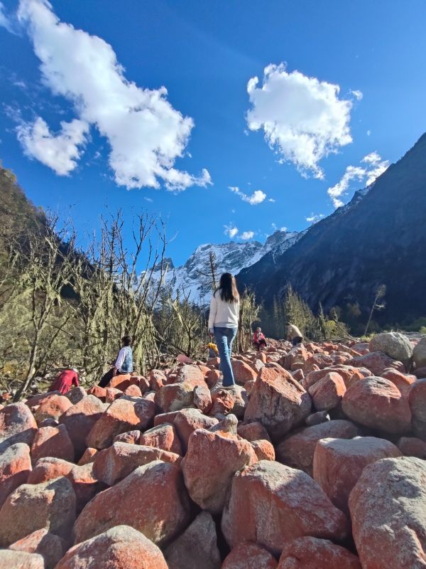 【红石滩】在大二普游玩结束后,我们继续乘车前往凉台沟/红石滩,这里有雪山、森林、草甸、溪流…尤其是规模宏大的红石滩,是除了海螺沟红石滩之外,中国第二大红石滩!!在山谷里绵延一两公里,非常壮观,山地立体型气候,空气污染度为零,属于原始生态景点,关键无门票。跟随领队前往红石滩徒步2公里,近距离感受雪山脚下的红色石滩,在此游玩2个小时。