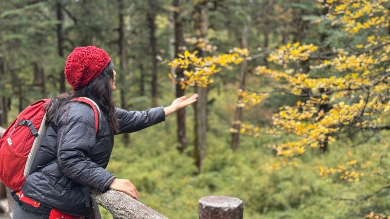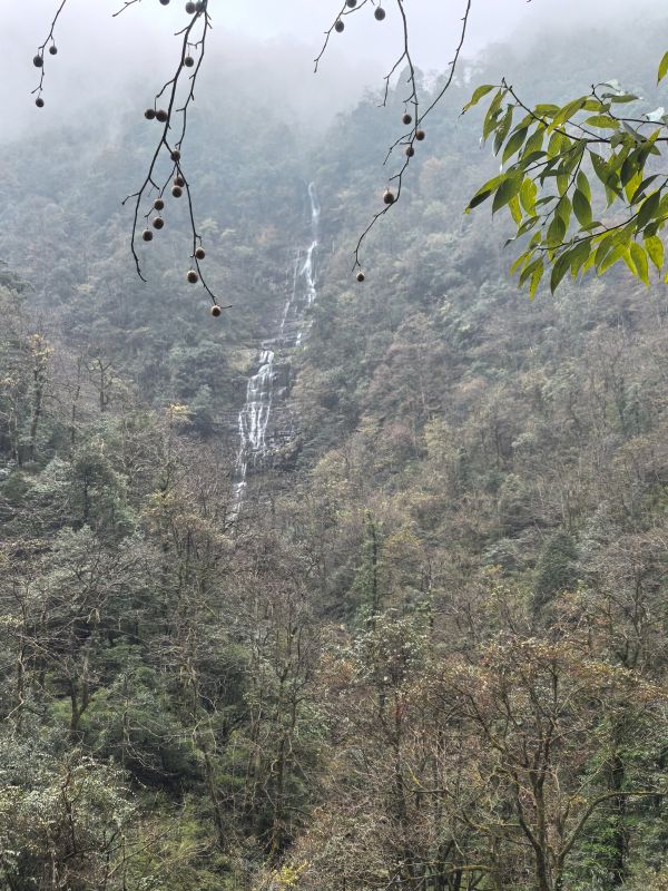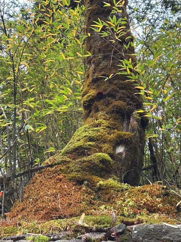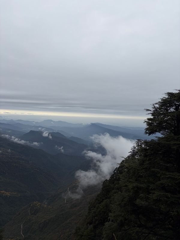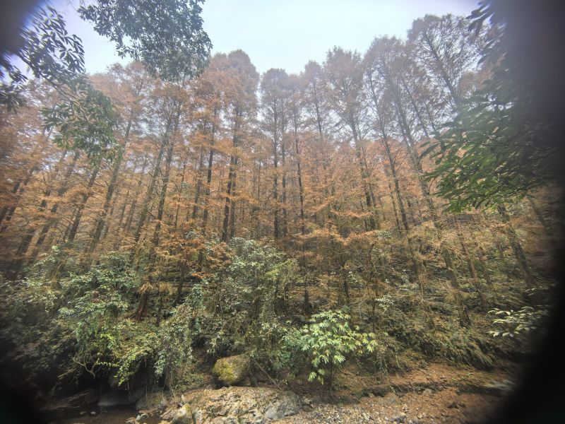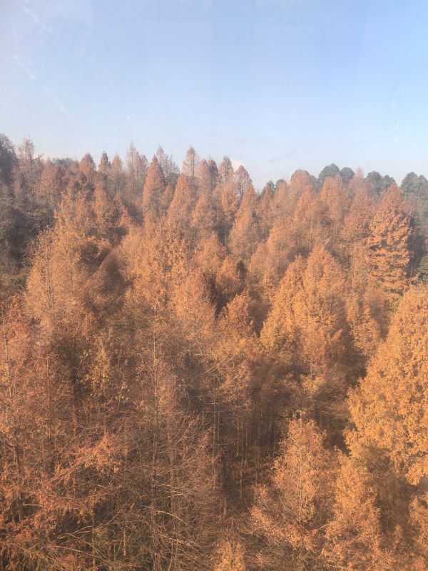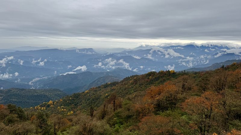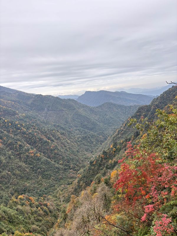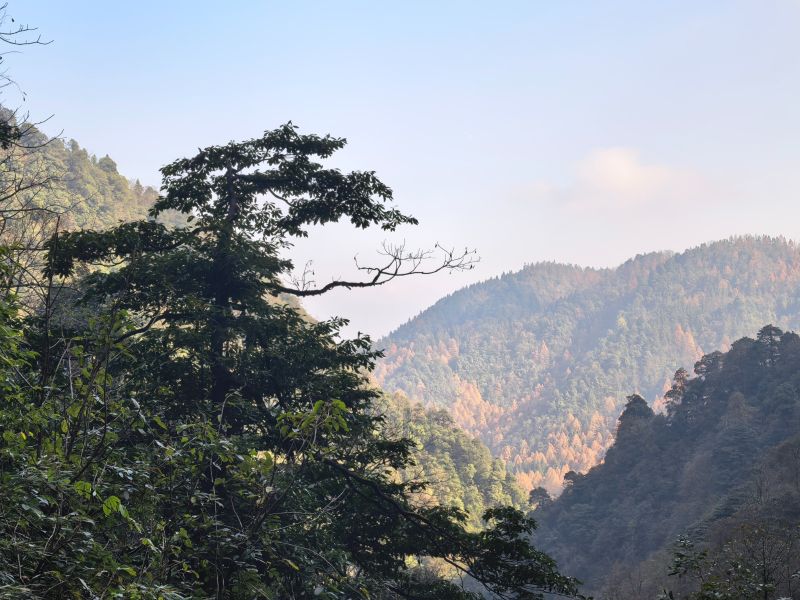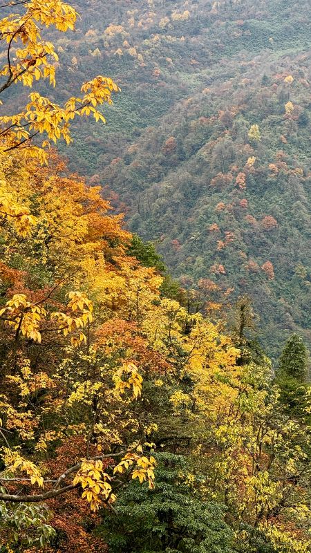 逐渐变色的枫树、珙桐、银杏、杉树、柏树...混杂在常绿植被中,五彩斑斓,像是上帝不小心打翻了颜料。