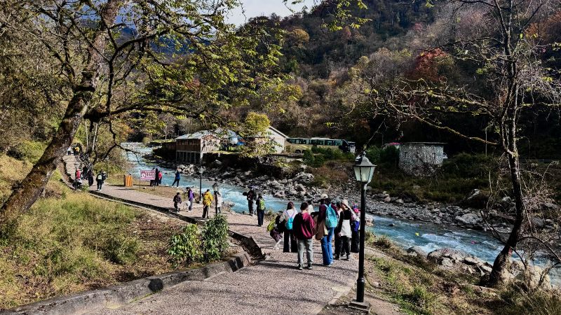【东线:徒步游览区】往返全长9KM的生态游步道修建于河岸两边,一路上泛蓝的潺潺溪流、遇见火出圈的木质吊桥、金黄色的的森林景观,在终点观倾泻而下的蓝水晶大瀑布以及隐藏高山间的银海湖。