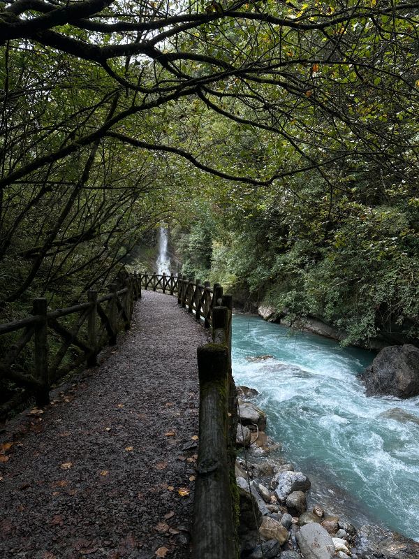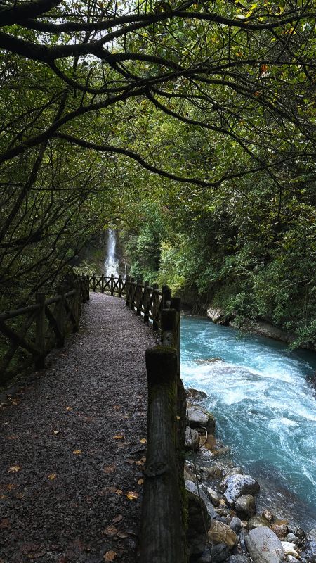 【东线:徒步游览区】往返全长9KM的生态游步道修建于河岸两边,一路上泛蓝的潺潺溪流、遇见火出圈的木质吊桥、金黄色的的森林景观,在终点观倾泻而下的蓝水晶大瀑布以及隐藏高山间的银海湖。