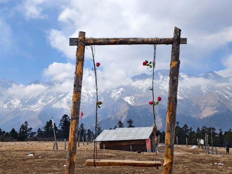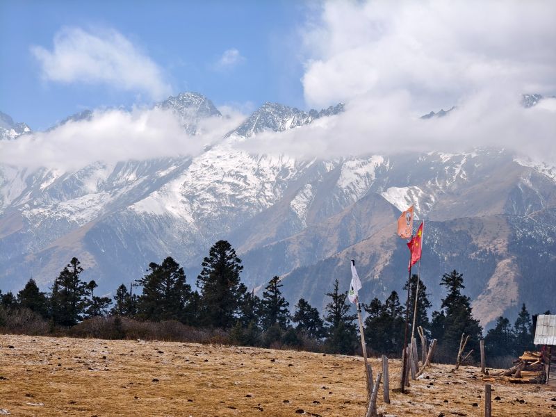 穿过最后一段树林,迎面一片宽阔的草场,雪山浮现视野。
