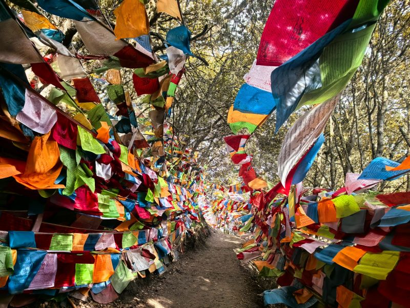 略显陡峭的山间小径,走起来稍微费力。不甚明显的山路纵横交错,几度往返终至第一个山脊平台,翻飞的经幡中穿行,像是经历灵魂的洗礼。