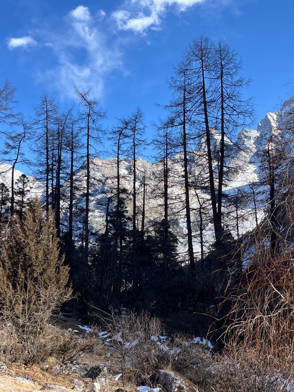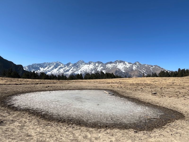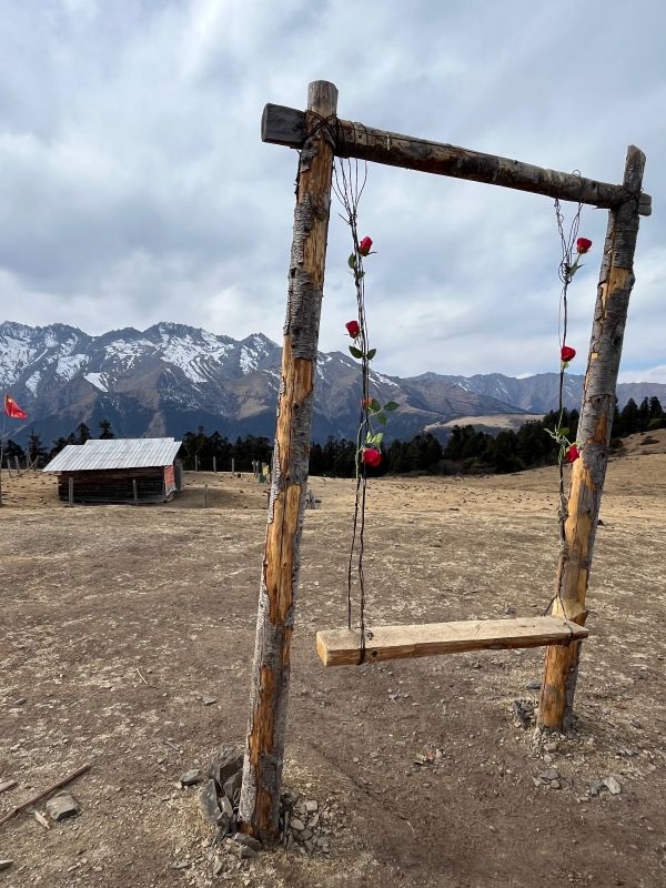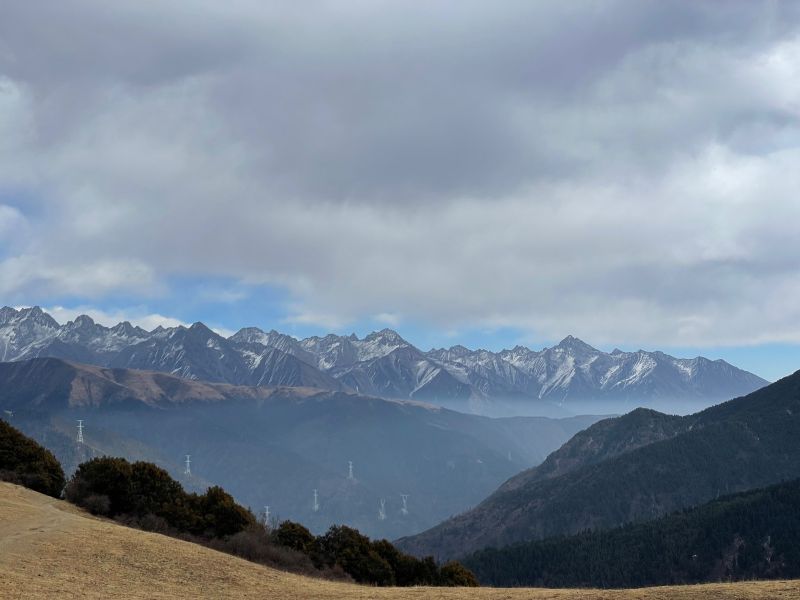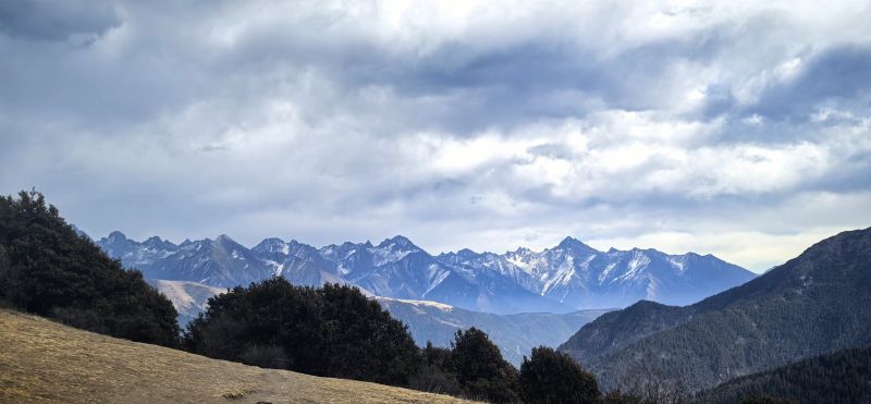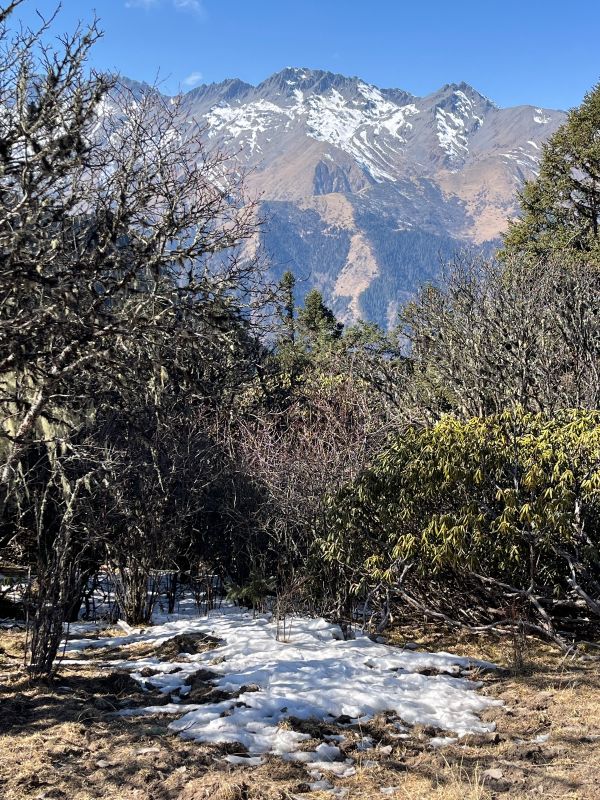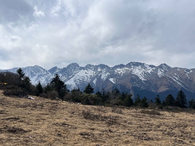 穿过最后一段树林,迎面一片宽阔的草场,雪山浮现视野。