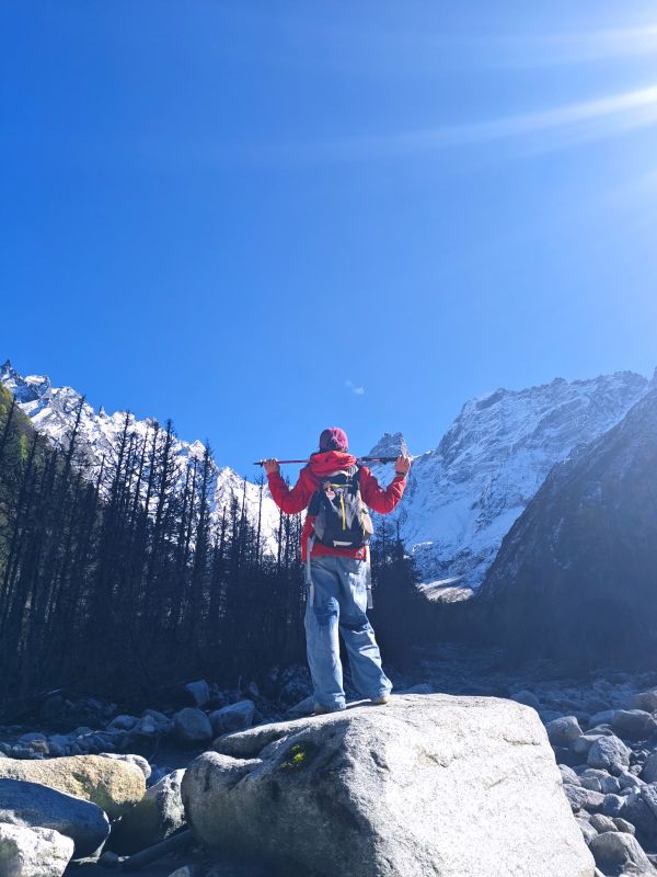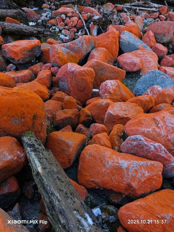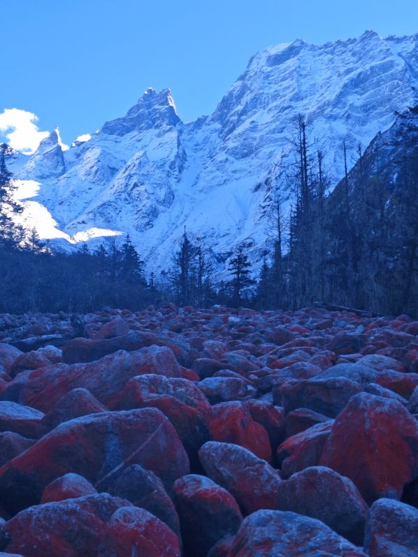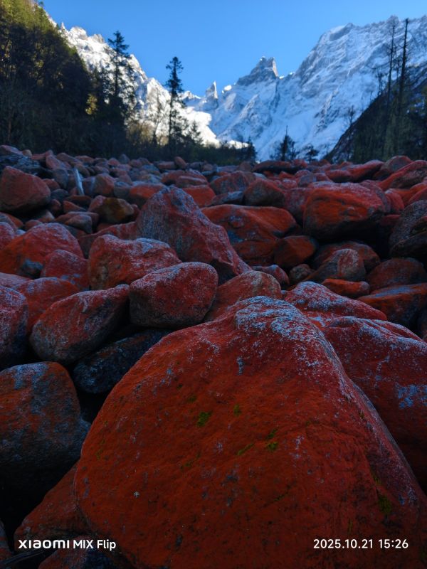 【红石滩】在大二普游玩结束后,我们继续乘车前往凉台沟/红石滩,这里有雪山、森林、草甸、溪流…尤其是规模宏大的红石滩,是除了海螺沟红石滩之外,中国第二大红石滩!!在山谷里绵延一两公里,非常壮观,山地立体型气候,空气污染度为零,属于原始生态景点,关键无门票。跟随领队前往红石滩徒步2公里,近距离感受雪山脚下的红色石滩,在此游玩2个小时。