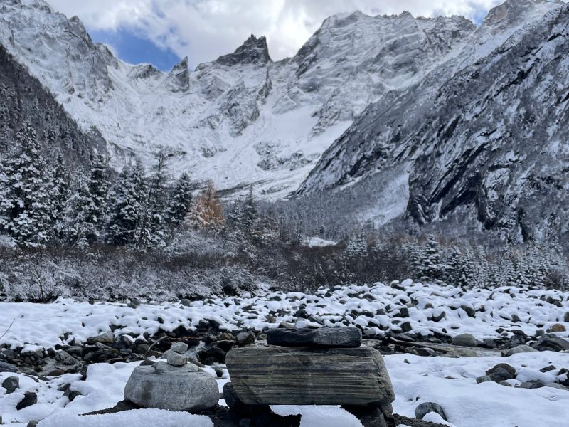 【红石滩】在大二普游玩结束后,我们继续乘车前往凉台沟/红石滩,这里有雪山、森林、草甸、溪流…尤其是规模宏大的红石滩,是除了海螺沟红石滩之外,中国第二大红石滩!!在山谷里绵延一两公里,非常壮观,山地立体型气候,空气污染度为零,属于原始生态景点,关键无门票。跟随领队前往红石滩徒步2公里,近距离感受雪山脚下的红色石滩,在此游玩2个小时。