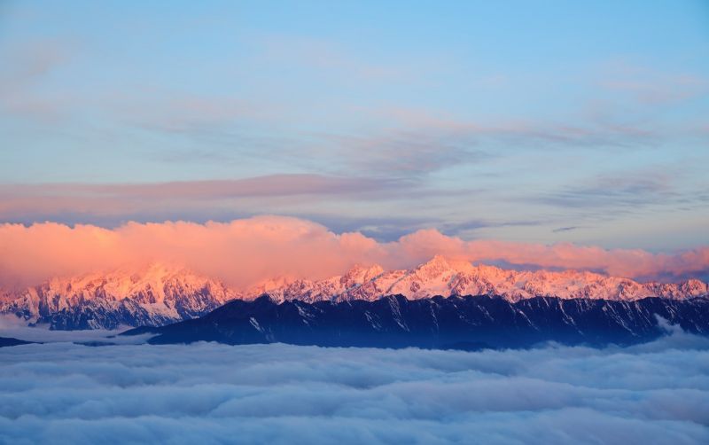 “蜀山之王”贡嘎雪山矗立于牛背山的正西最高点,虽然海拔不算太高,但牛背山的山顶可观云海、日出、夕阳、佛光、星轨等自然美景。