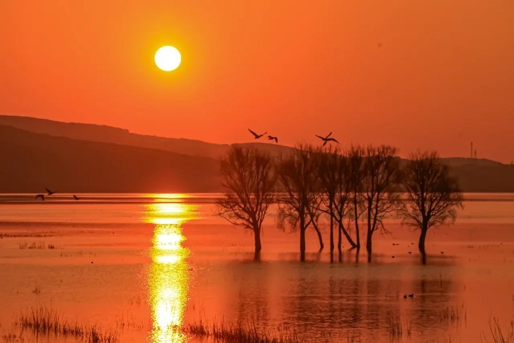 晨曦中看鹤群掠过湖面