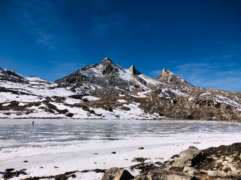 水波粼粼的湖面已结蓝冰,在行者悄然路过不知情的时候,它在阳光照射下静谧渡过了冬季,越靠近雪山那头,冰面越蓝。
