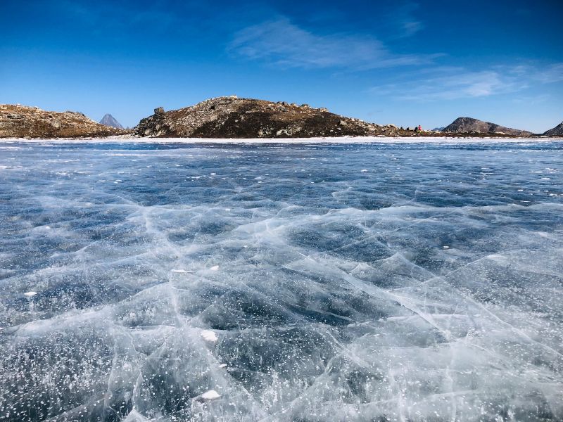 冰冻的湖面上透出一层层细小的纹理,在太阳光的照射下如俄罗斯姑娘深邃湛蓝的眼眸一样明艳动人。