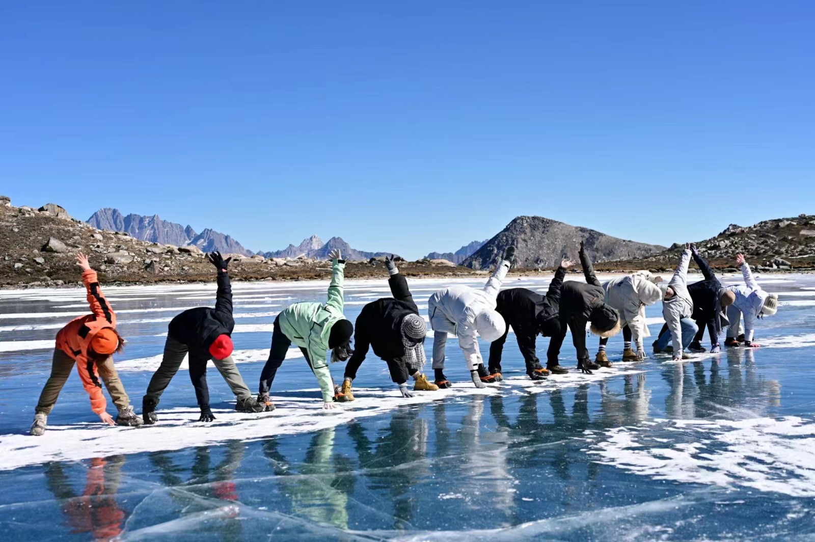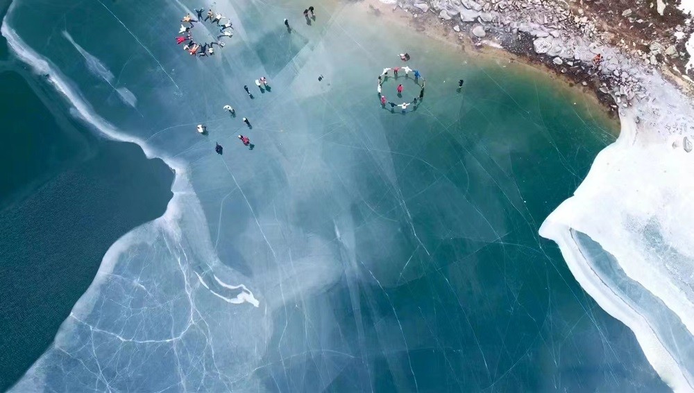 这里不仅有壮丽威严的雪山,还有晴空万里的蓝天,夏季这里湖水清澈如镜,冬季,湖水化作晶莹剔透的蓝冰,圣洁而冷峻。