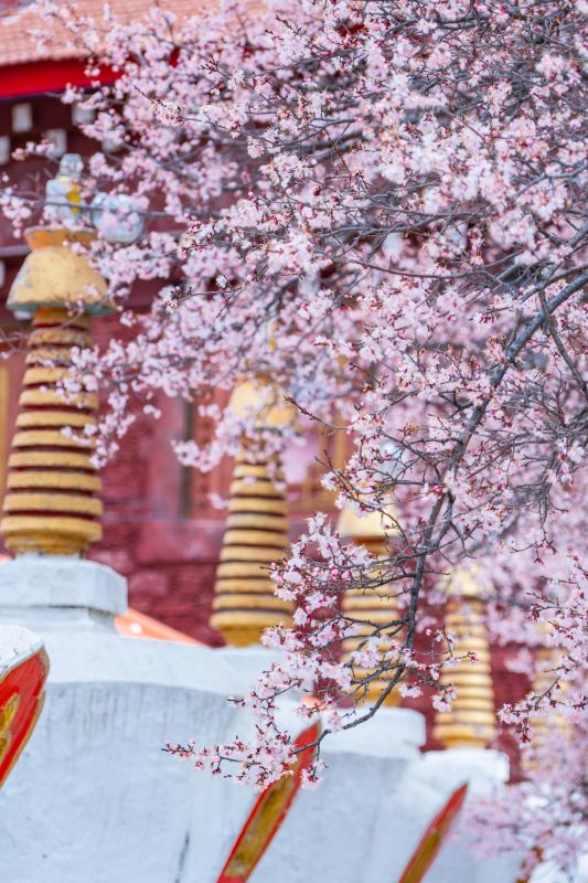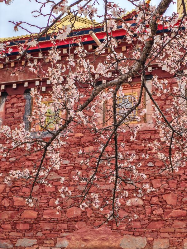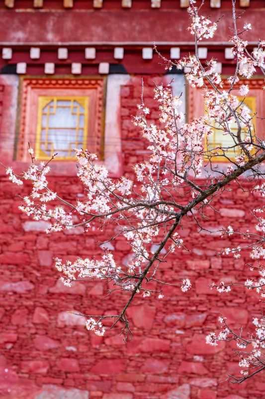 粉白杏花缠绕着白墙红壁的藏式民居