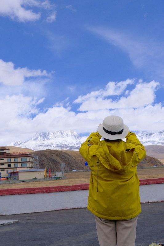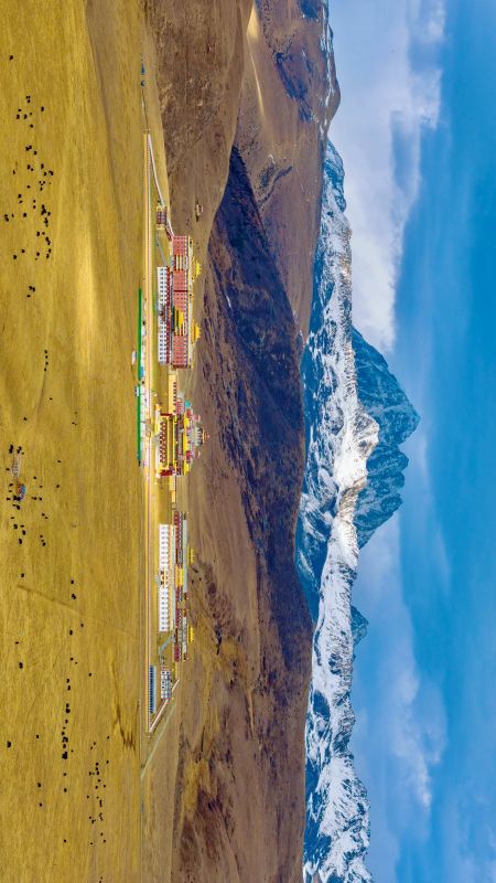 与藏式民居、远山雪景相融