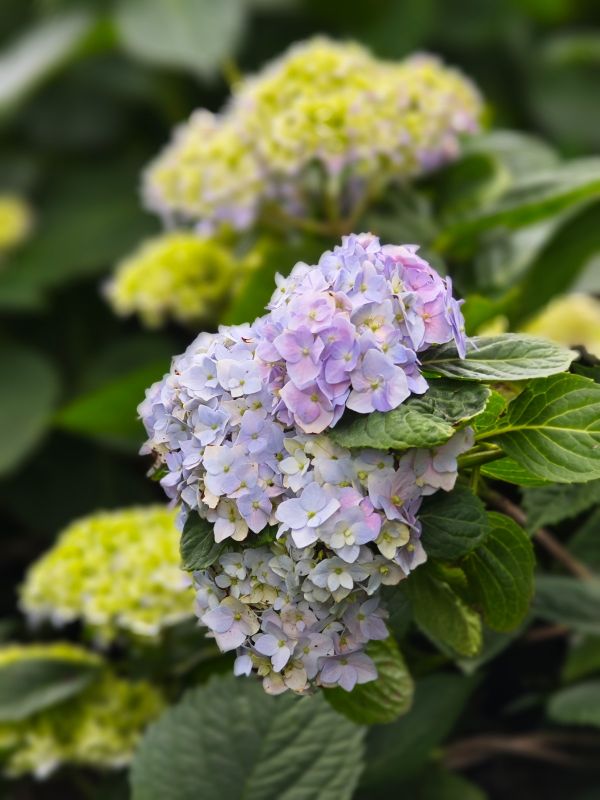 红的、蓝的、粉的、白的……各色绣球花开满了整个寺院。开在红墙角,绽放在窗下。
