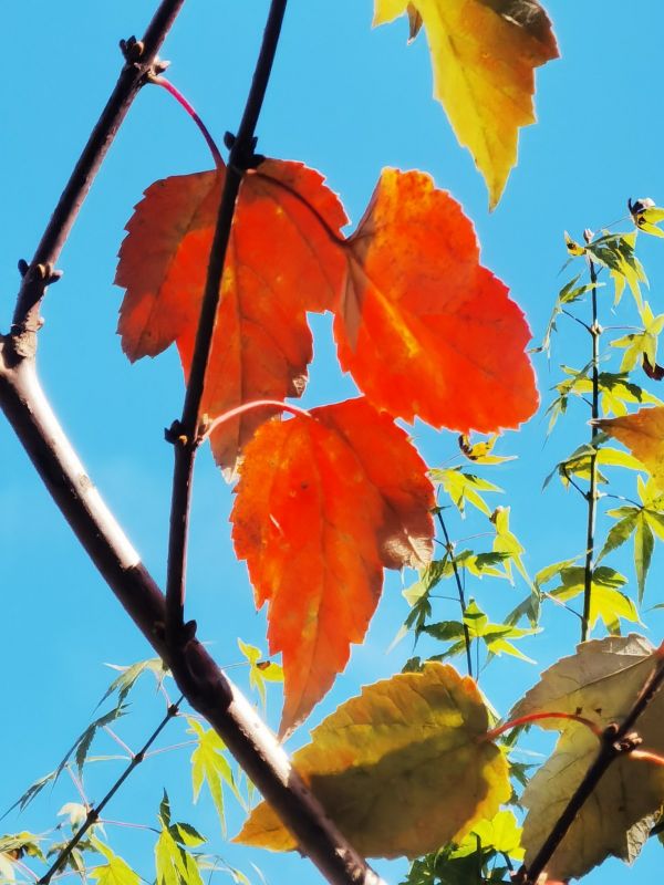 叶红枝头,霜染山坡,流连于恢弘的境界中,徜徉于静谧的世界里。枫叶流丹,层林如染,如烁晚霞,这一切比江南二月的春花还要火红,还要艳丽!