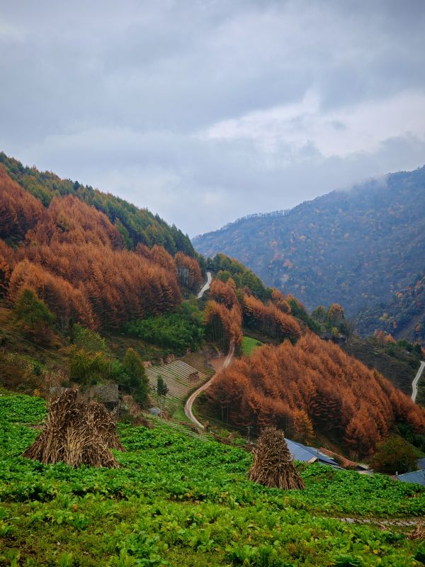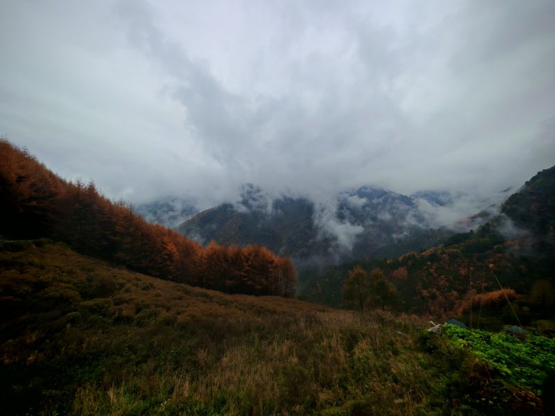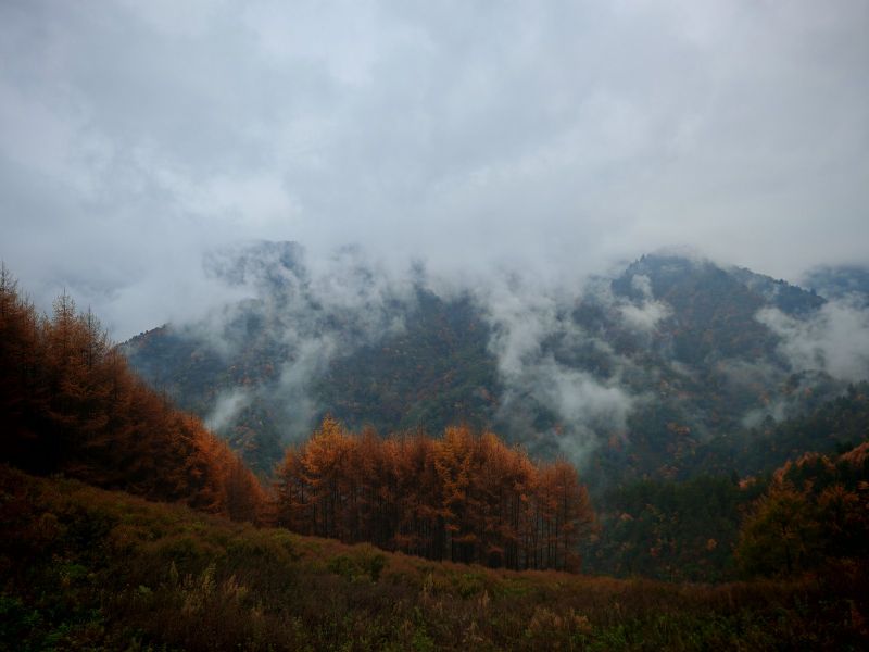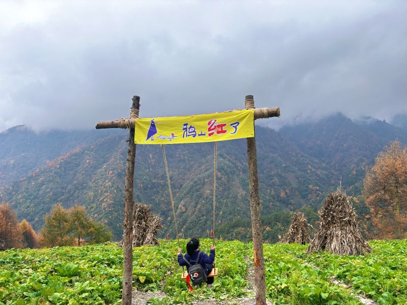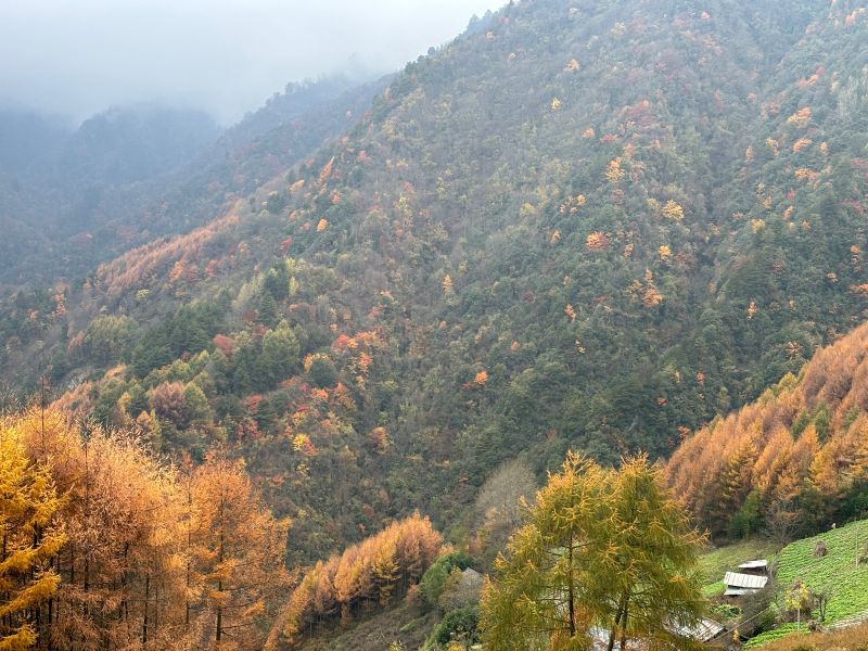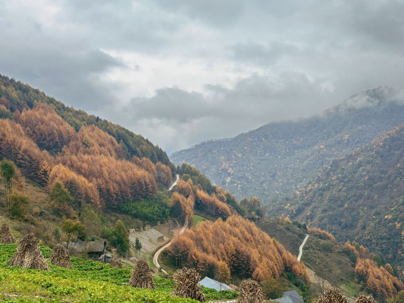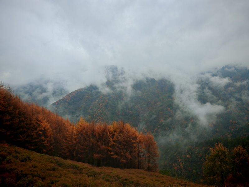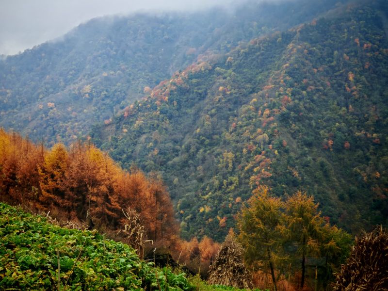 卧龙老鸦山位于耿达乡境内,老鸦山秋季以黄杉为主,登上空旷之地一眼望去,漫山黄杉尽收眼底,与山下的绿色有着清晰的分界线,带来强烈的视觉效果。