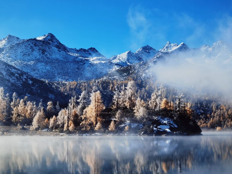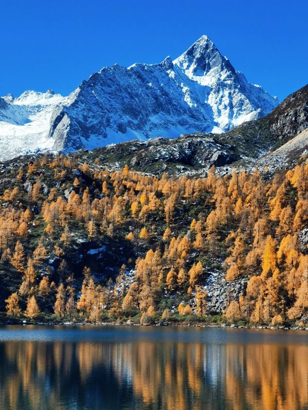 依拉措,其实与党岭的葫芦海、卓雍措(大海子)就是一山之隔,它的湖水底色,无论天气阴晴都呈淡乳白蓝色,就像四川著名景点稻城的牛奶海一样,周边植被主要是大片的红杉林,太阳初升的金光万丈,还有热烈似火的雪山金字塔,双双投影在湖面,光影斑驳、澄澈入镜,整个湖泊恍若遗世仙境。