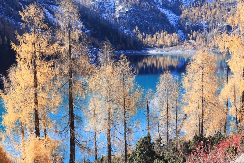 葫芦海是第四纪冰川退缩后形成的高原堰塞湖,形如葫芦,如提琴,如宝镜。湖泊清透平静、美妙倒影、奇光异色,海子的侧畔,一株株红杉挺拨而遒劲,茂密而干练的针叶由绿变红。