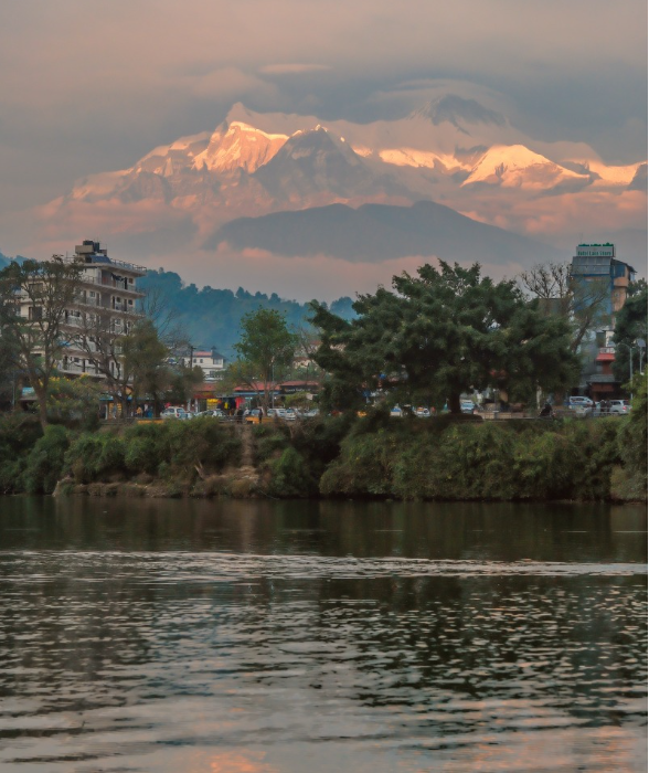 与热闹喧嚣的加德满都比起来要恬静很多,依偎在终年积雪的安娜普纳山峰和鱼尾峰下,傍着迷人的费瓦湖,苍翠繁茂的植被和壮丽的雪山风光形成强烈对比,成为尼泊尔最受欢迎的旅游地点之一。