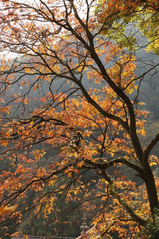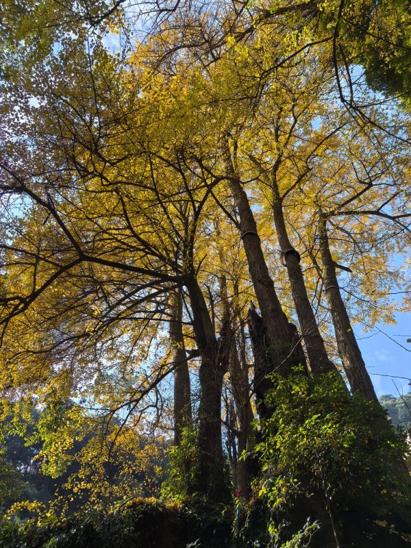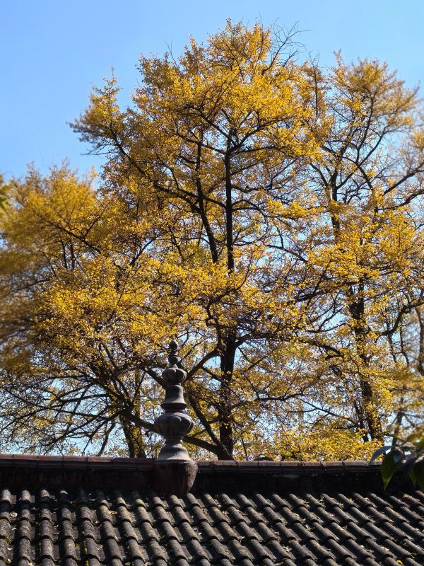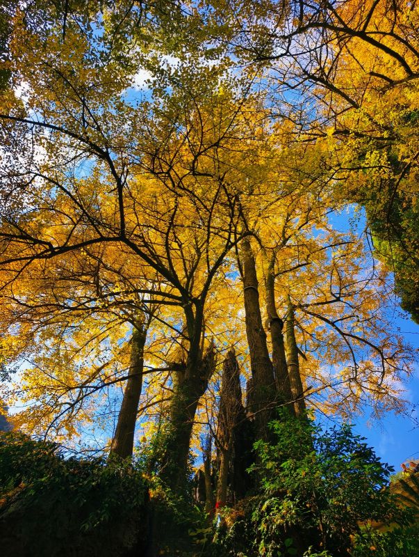 3.寺庙旁的“九株同根”银杏古树源于夏商时代,堪称绝代佳木。深秋,又是银杏正黄时,穿越其中分外美丽。