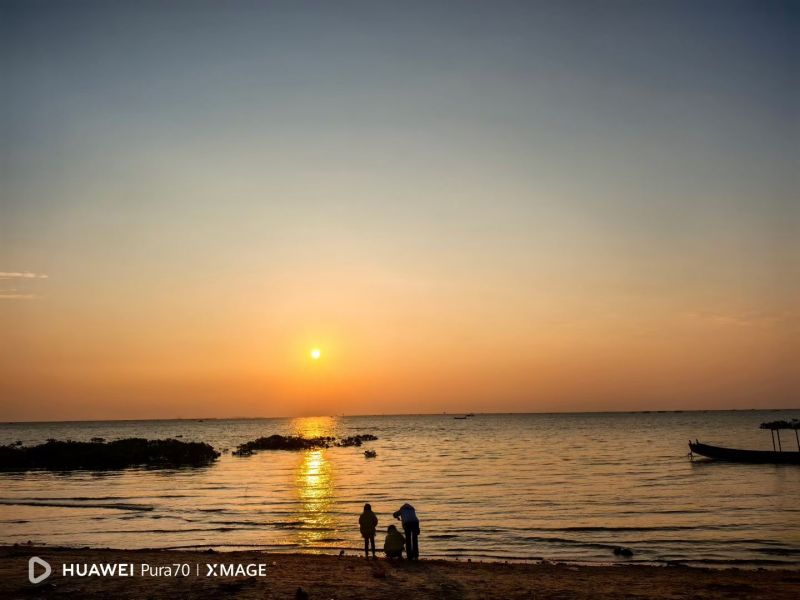 金滩之沙金黄、细腻而柔软,纯天然的沙滩延绵数十里,站在金滩上,迎着海风,隔着蔚蓝色的海水,可以遥望西南方向水天一色的越南海景。