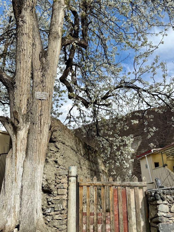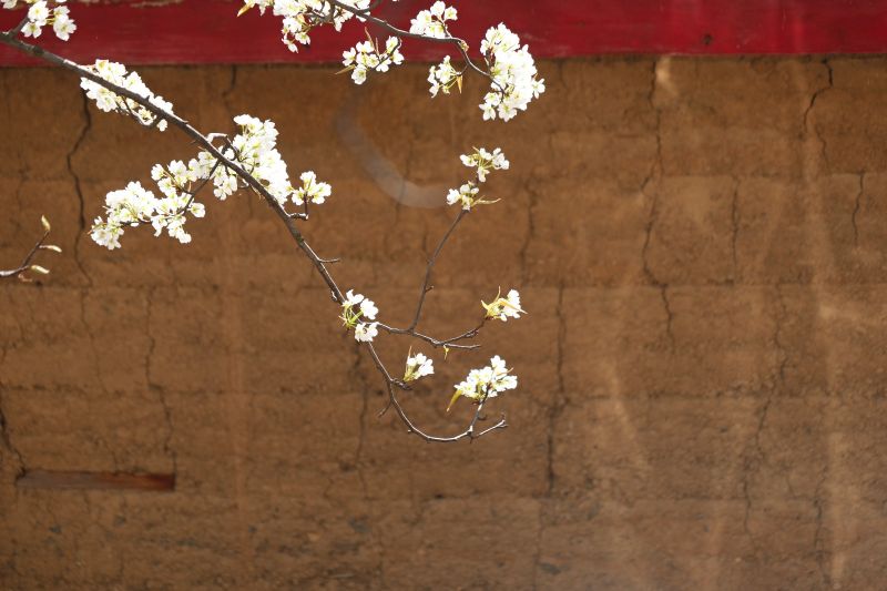 同是梨花,金川的梨花却与别处梨花不同,金川的梨树,树身高大,最老的一株梨树便生长了一百多年,树身高大,至今生长良好,一簇簇花朵开得非常茂盛,花瓣如丝绒般柔和。脱离了诗人形容梨花带雨的娇怯模样,反而显得雍容华贵。