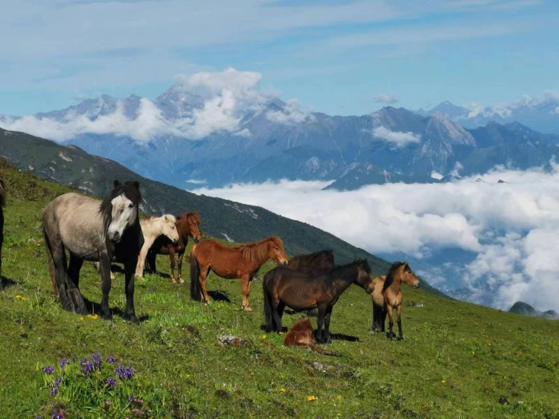 从五月到十月,杜鹃花、报春花、鸢尾花、翠雀花、马先蒿、绿绒蒿、紫菀花……相竞开放,草甸五颜六色,清风中伴着阵阵花香,使得这里成为了一座绚丽多彩的天国花园,一处不可错过的风景地。