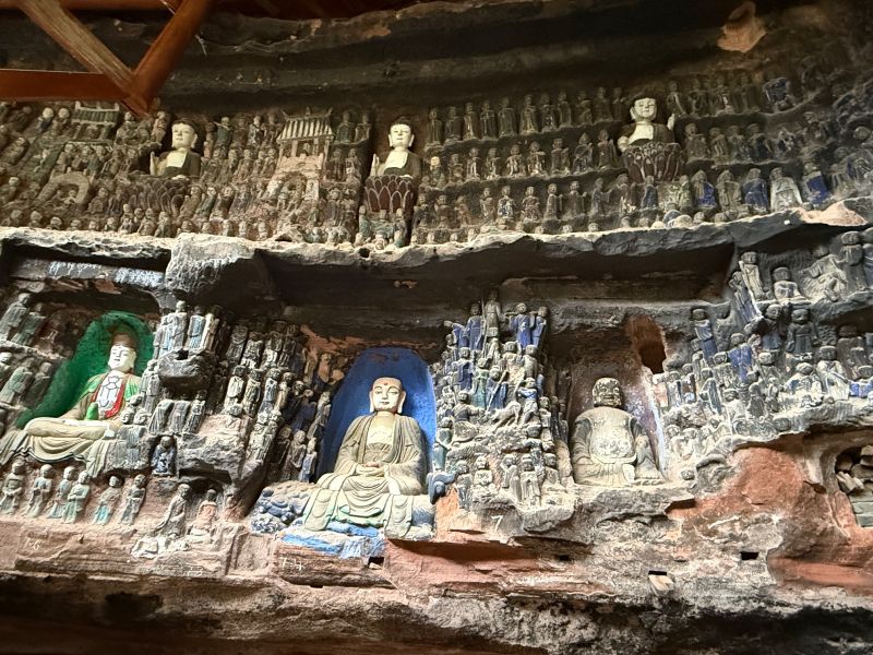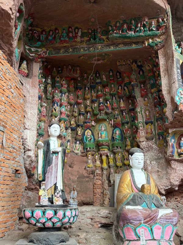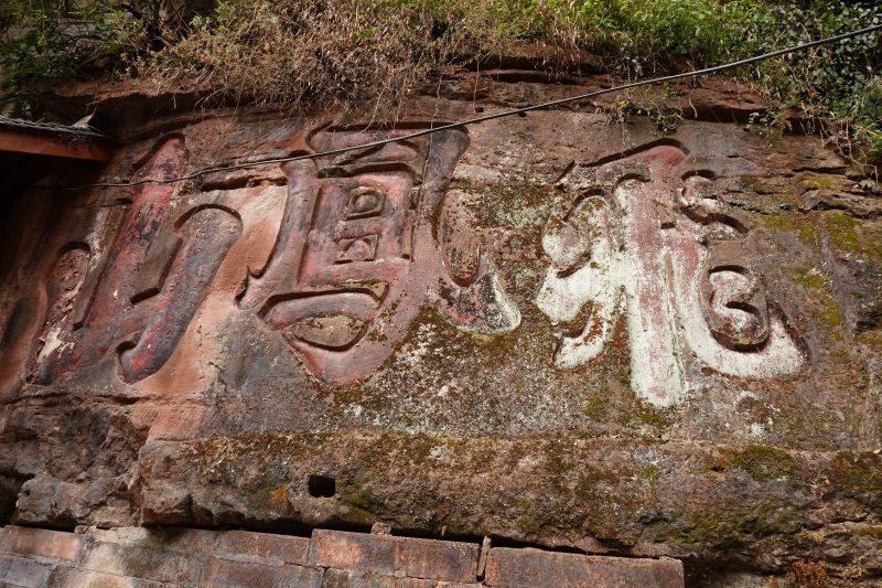清风拂过,在空气中卷起涟漪,穿行于一草一木,石径蜿蜒,美得极致,似乎只有最初的童真和心灵在行走。经过将近一个小时的跋涉后,药师岩石窟终于出现在了眼前。首先映入眼帘的是在悬崖上镌刻的“飞凤山”三个浑厚的大字,药师岩的石刻塑像群,在半山腰的峭壁之上,密密麻麻的摩崖雕像占据了整个山壁,身临其中,一种威严敬畏的感觉油然而生。