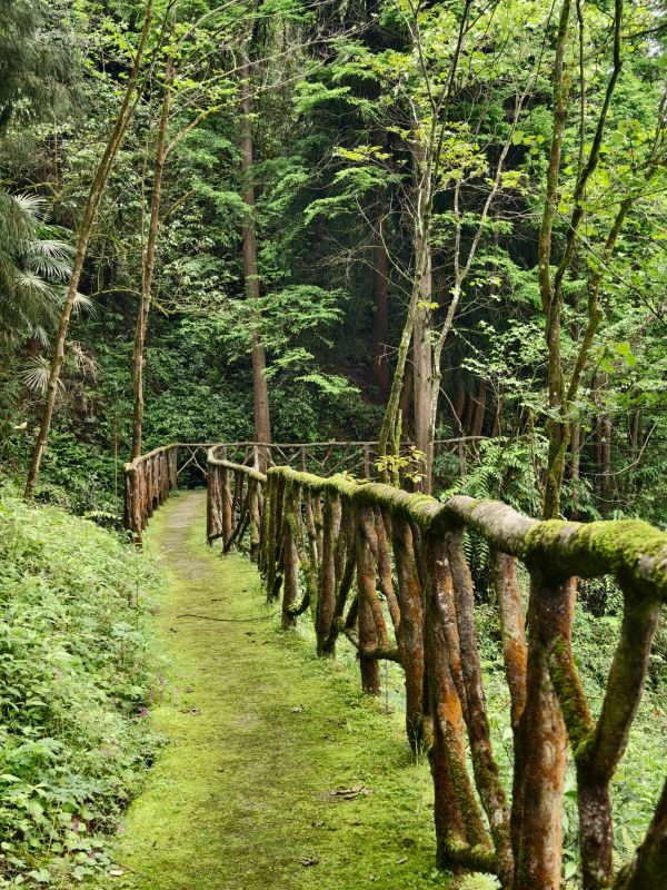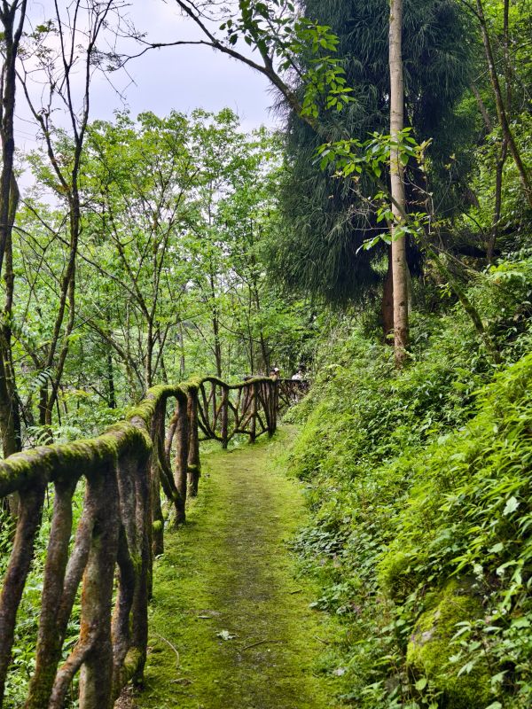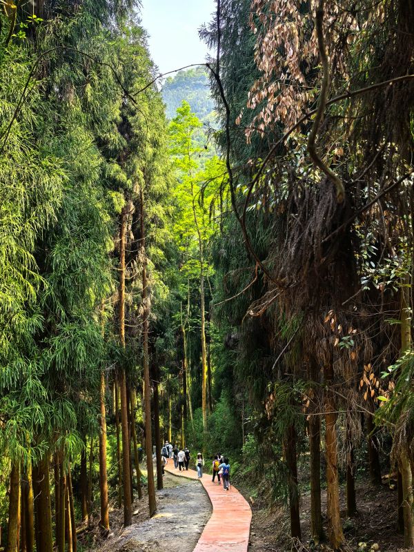 步道全程被茂密林木包裹,阳光透过枝叶洒下斑驳光影。