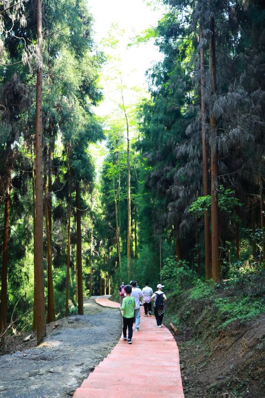 广济三江福道起于三江村2组登山栈道,止于三江村3组登山步道,全程约5公里,步行整条环线,大概需要3-4小时,步道蜿蜒穿梭于密林之间,路况平缓适宜,兼顾徒步舒适度与观景体验。
