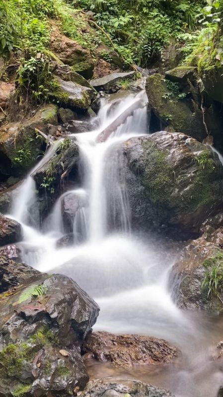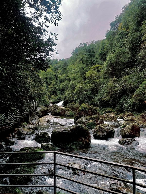 进入景区后,沿着溪涧走,山风徐来,空气中飘散着一丝幽幽香气,淡淡的,不知道是什么花, 道路边时而是小桥流水,时而流泉飞瀑,走走停停,听山谷鸟鸣,见树苔青翠。想到负氧离子,这里的指数一定好!到!爆!表!
