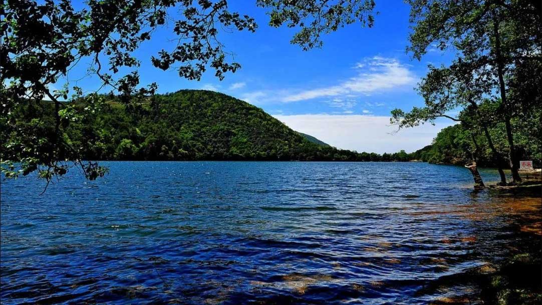 山水林木特别明亮清新,登高俯瞰,海子酷似一颗镶嵌在群山中熠熠闪光的蓝宝石,晶莹剔透。湖中成群结队的野鸭飞扑鸣叫,凫游戏水。信步彝海边,犹如融进水墨画的笔峰墨迹之中,令人遐思万千,心旷神怡。