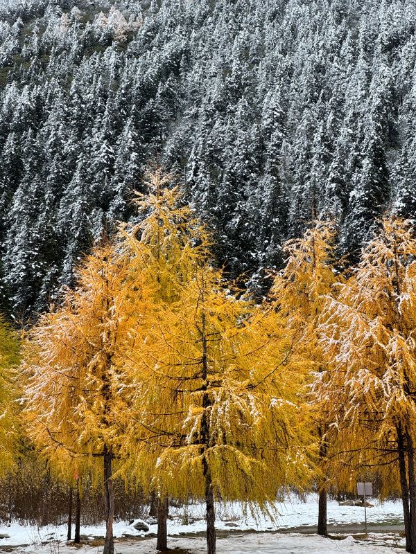 一天之内看到了毕棚沟的秋和冬,太值啦!本来出发前看天气预报还很担心下雨,结果没有下雨,还出了一点点太阳,边出太阳边飘小雪,超浪漫的!相信我的旅行欧气! 每次都能看到意料之外的美景。 如果能吃大太阳的话肯定更漂亮,希望下次有机会再挑一个好天气来玩~